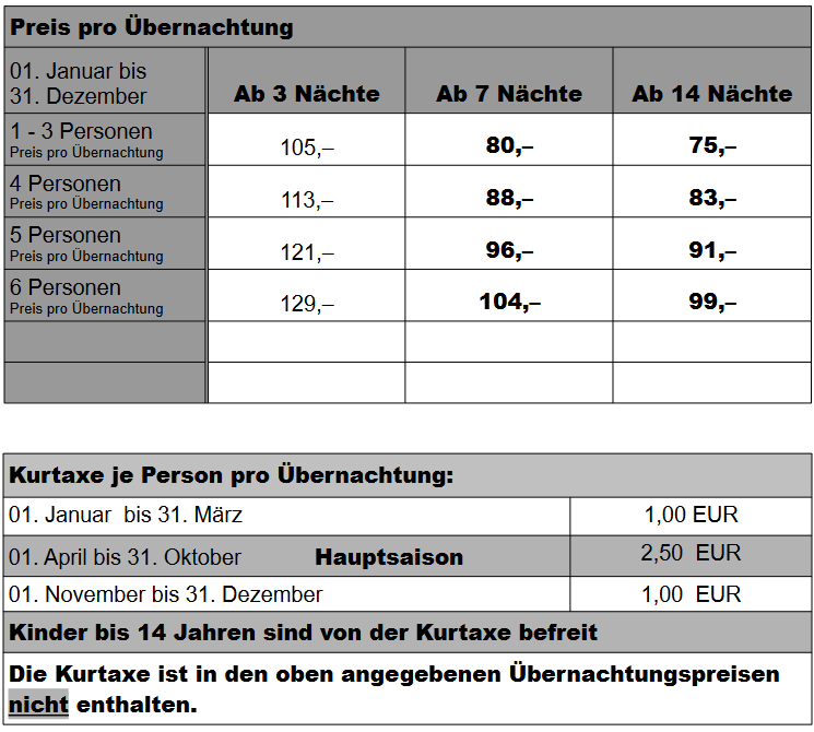 Wir bieten Ihnen neben den drei Doppelbetten zusätzlich zwei Kinderbetten und ein Babybett/ Gitterbett an. Der Preis für jede weitere Person beträgt zusätzlich 8,- EUR/ Nacht zum oben angegebenen Preis.
