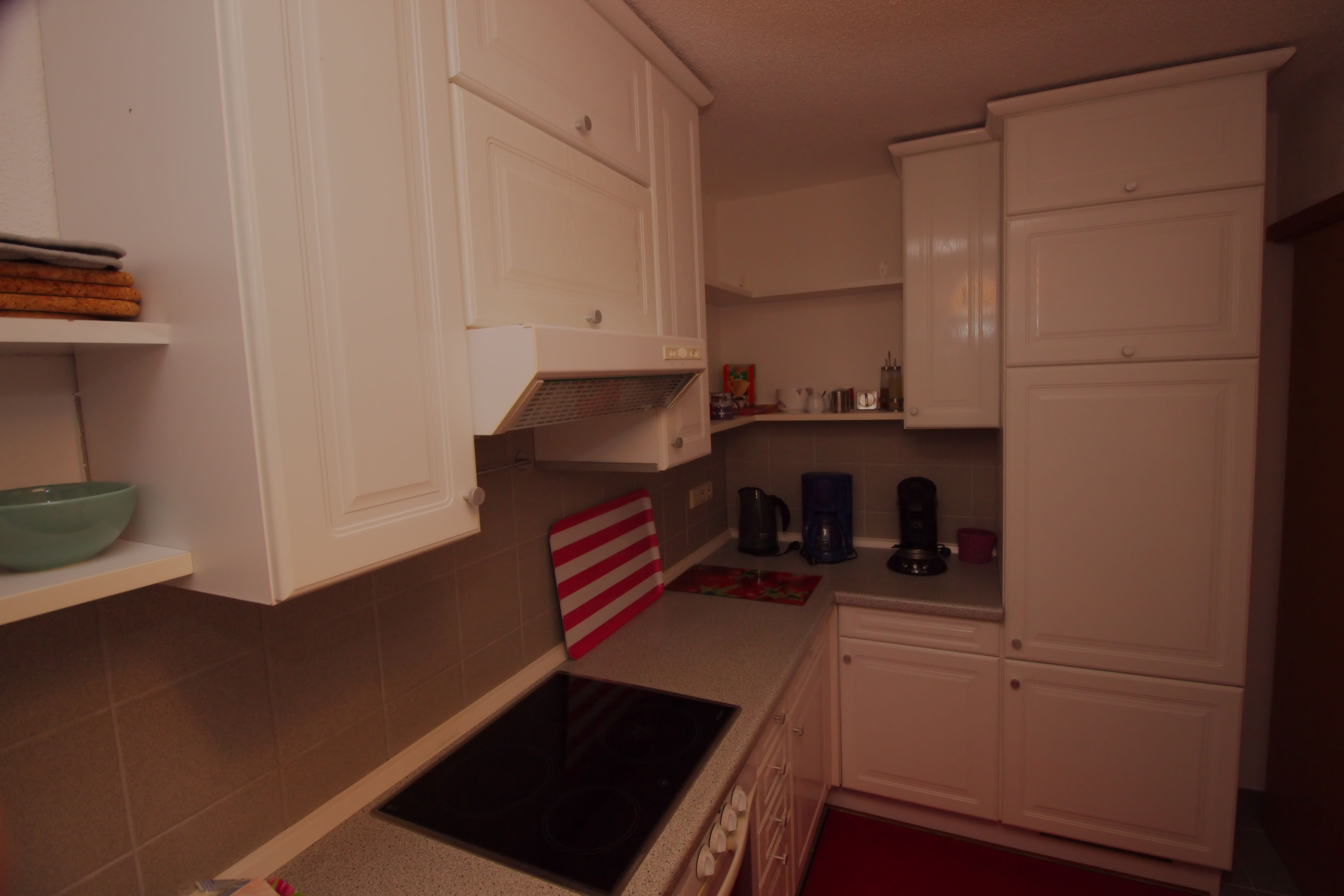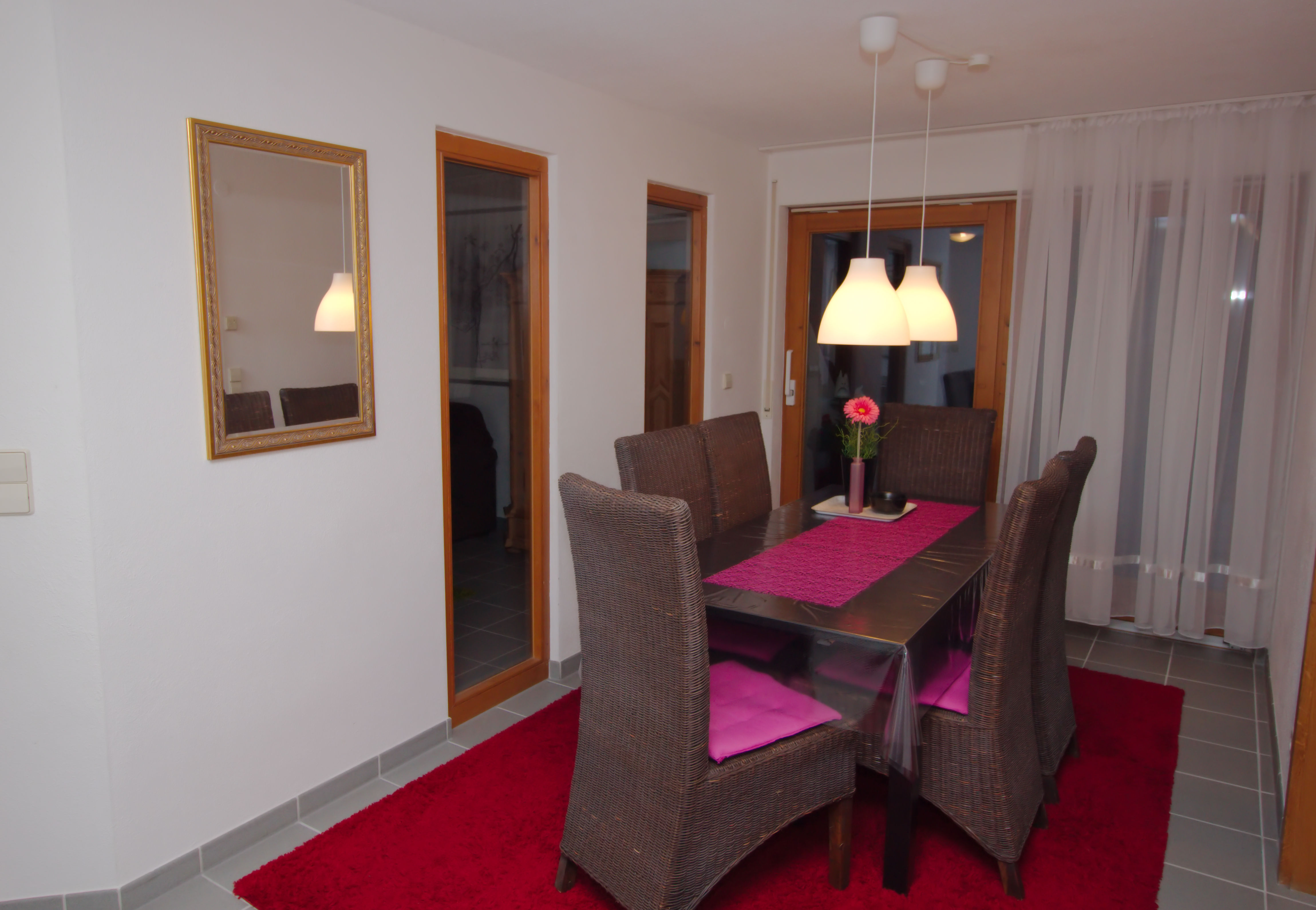 Der offene Essbereich liegt direkt neben Balkon und Küche. Er bietet Platz für sechs Personen. Die Küche ist voll ausgestattet und kann durch eine Tür vom Rest der Wohnung abgetrennt werden. Bei Bedarf stellen wir Ihnen gerne einen Kinderhochstuhl zur Verfügung.